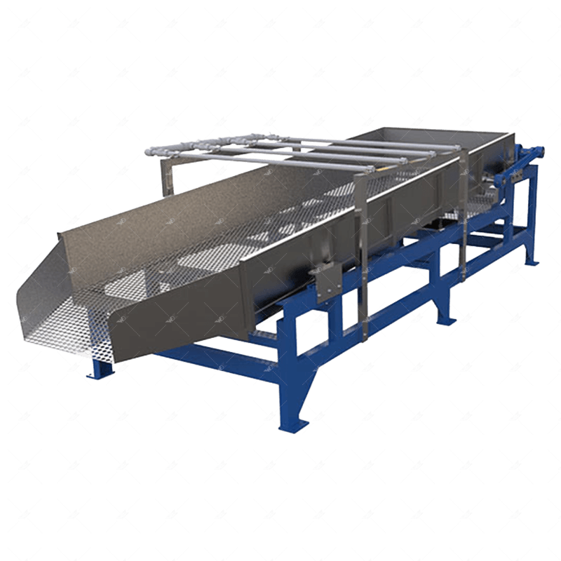 The screen is driven by an eccentric crankshaft to perform high-frequency linear reciprocating motion. As wet granules move along the inclined screen, water is discharged through the mesh by gravity and vibration. An overhead spray system provides a final rinse to remove residual fine impurities, further improving material purity.